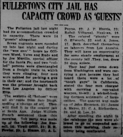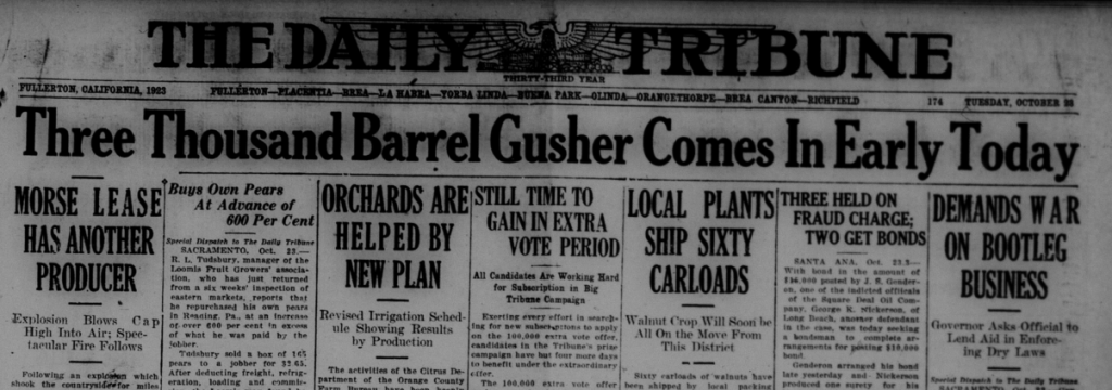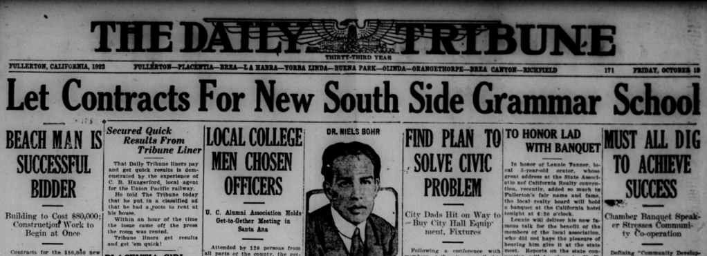 The Local History Room of the Fullerton Public Library has microfilm from the Fullerton Tribune newspaper stretching back to 1893. I am in the process of reading over the microfilm, year by year, to get a sense of what was happening in the town over the years, and creating a mini archive. Below are some news stories from 1923.