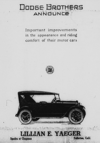 Other dealerships included O.L. Smith’s Oakland dealership on West Amerige, Albert Sitton’s Willys-Knight dealership on West Commonwealth, Lillian Yeager’s Dodge dealership in Spadra (Harbor) and Chapman, and William Goodrum’s Buick dealership.