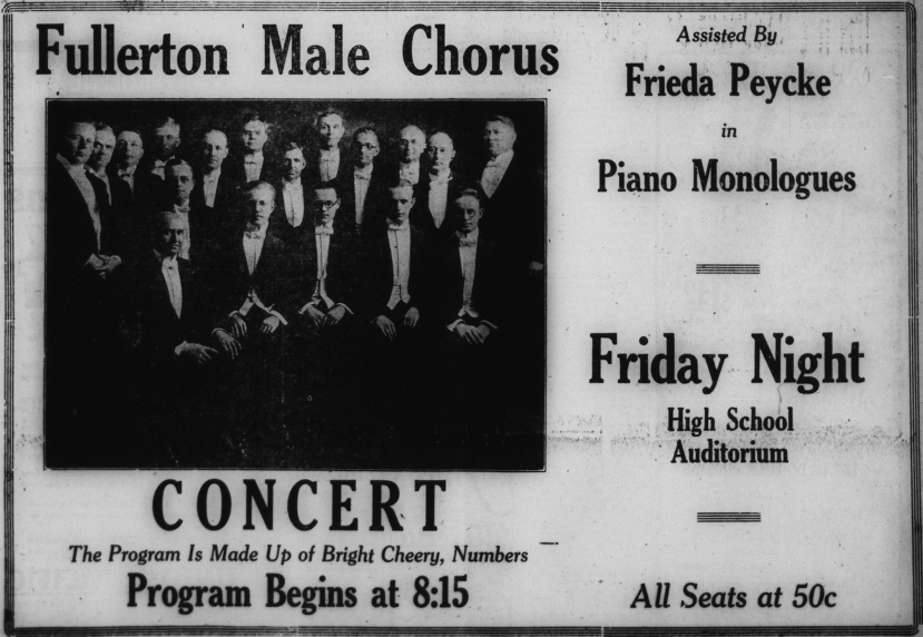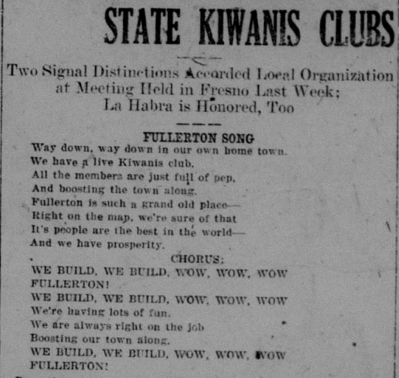 Another popular local group was the Kiwanis. At a meeting of the state Kiwanis clubs, a poem was printed in the Tribune, honoring the Fullerton club.