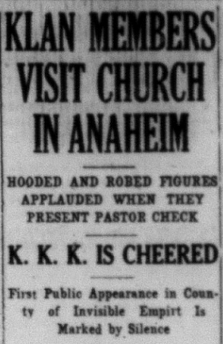 “The first public appearance in Orange county of members of the Invisible Empire, Knights of the Ku Klux Klan, in the First Christian church tabernacle, Anaheim, last night was marked by lusty cheers of the congregation, and unlike popular beliefs was not featured by bloodshed or riot,” the Tribune states. “While scores sat emotionless in their seats, petrified by mingled fear and amazement, what is estimated to have been more than a dozen of the white-robed and hooded figures silently entered the edifice, presented the partor, the Rev. C.L. Vawter, with a parcel and as silently departed.”