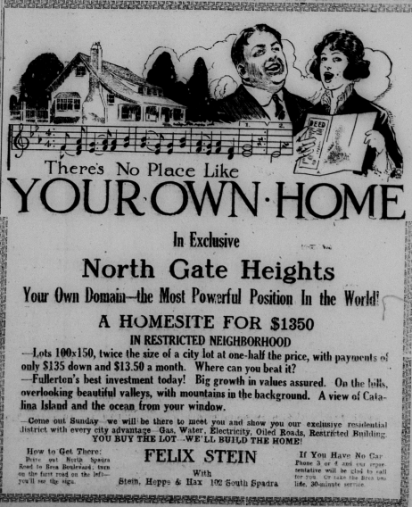 Throughout the 1920s, many new housing subdivisions were built, as the City grew. Spreading outward from the downtown area, orange and walnut groves were cleared for these new houses. Unfortunately, most of the subdivisions built in the 1920s had racially-restrictive housing covenants that prevented non-whites from purchasing these new houses. Virtually every issue of the Tribune had advertisements and articles about these new developments.