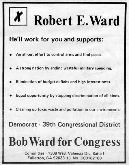 Former Mayor Bob Ward, an advocate for Coyote Hills open space, challenged arch-conservative William Dannemeyer for congress. He lost.