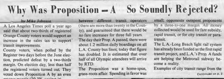 After the passage of Prop 13 placed severe limits on property tax increases, city council sought to fill the budget shortfall with a sales tax increase, which was roundly rejected by voters.