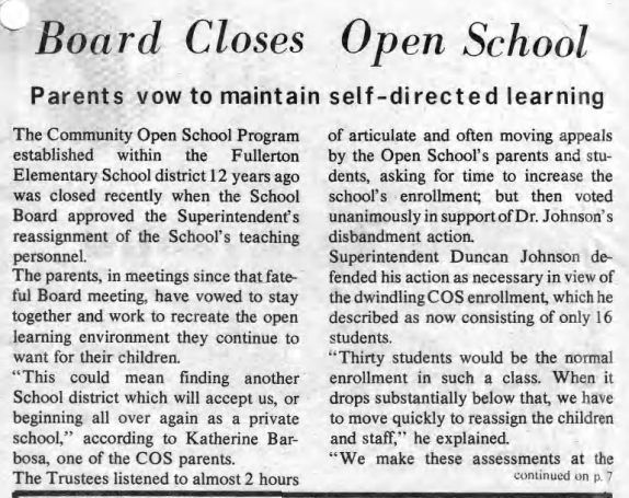 The School Board voted to close the Community Open School, an experimental form of education begun 11 year earlier.
