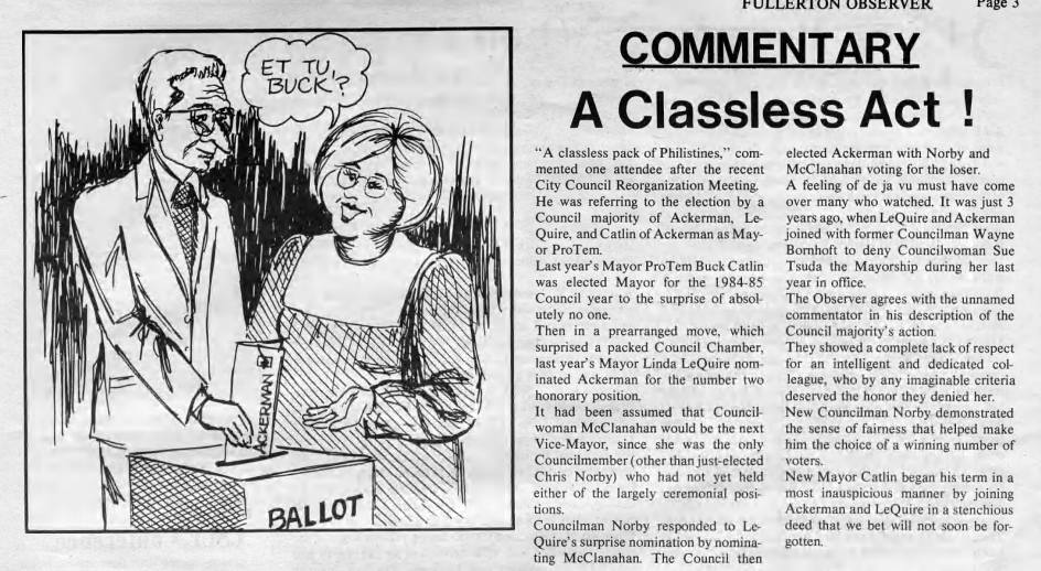 The Fullerton Observer newspaper was formed in 1978 by Ralph and Natalie Kennedy and friends to provide a more progressive counterbalance to the more conservative Fullerton News-Tribune and Orange County Register. The Fullerton Public Library has digital archives of the Observer stretching back to 1979. Here are some top news stories from 1984.