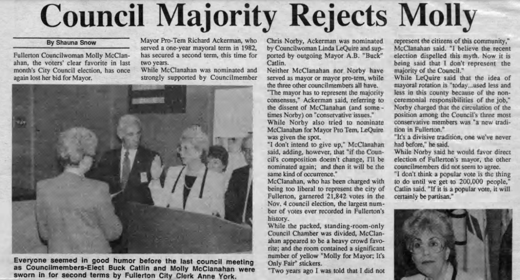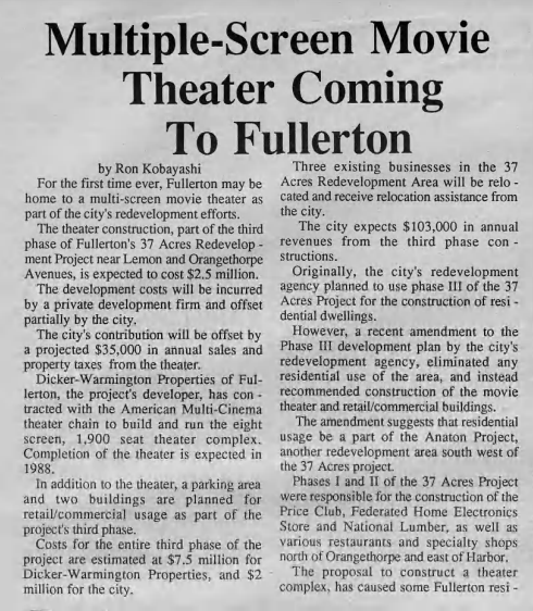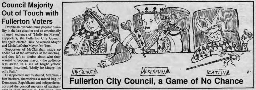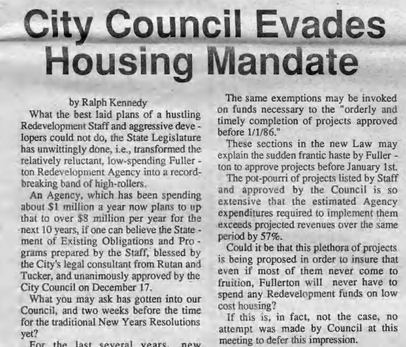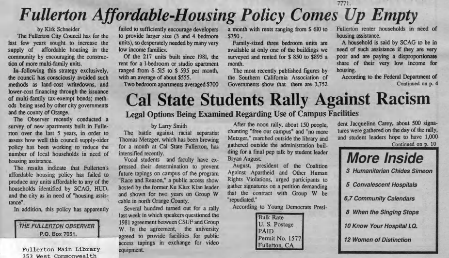 The Fullerton Observer newspaper was formed in 1978 by Ralph and Natalie Kennedy and friends to provide a more progressive counterbalance to the more conservative Fullerton News-Tribune and Orange County Register. The Fullerton Public Library has digital archives of the Observer stretching back to 1979. Here are some top news stories from 1986.