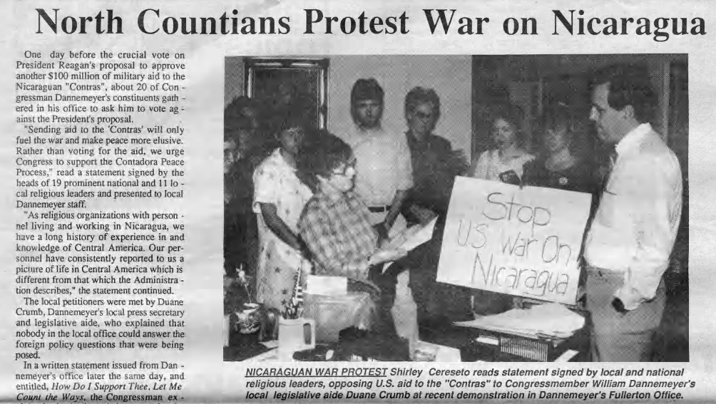 Local residents protested the United States’ involvement in the Civil War in Nicaragua. This would ultimately involve the Iran-Contra scandal that hurt, but did not end, the Reagan presidency.