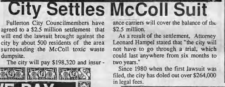 In other environment news, Fullerton settled a lawsuit brought by local residents as a result of the toxic McColl dump site, the City’s first Superfund site.