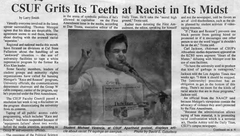 Some controversy arose at Cal State Fullerton as students protested against former Ku Klux Klan leader Tom Metzger taping his show “Race and Reason” on the campus.