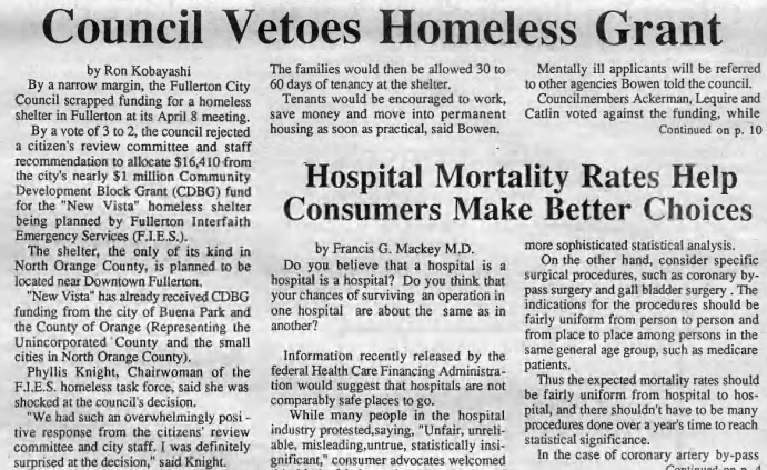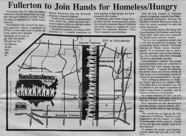 In 1986, Fullerton and other communities across the country participated in the “Hands Across America” event for the homeless and hungry. The Observer included a cartoon pointing out the hypocrisy of the council supporting this, while not allocating funds for a homeless shelter or affordable housing.