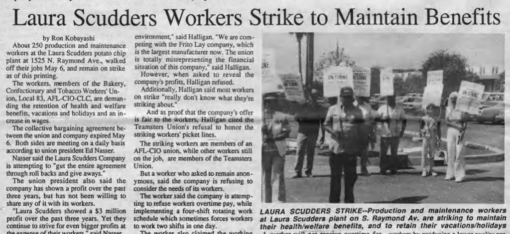 Workers at the Laura Scudder’s plant in Fullerton went on strike to preserve their benefits, which the company was planning to cut. Union membership declined in the 1980s, in part as a result of president Reagan’s anti-union policies.
