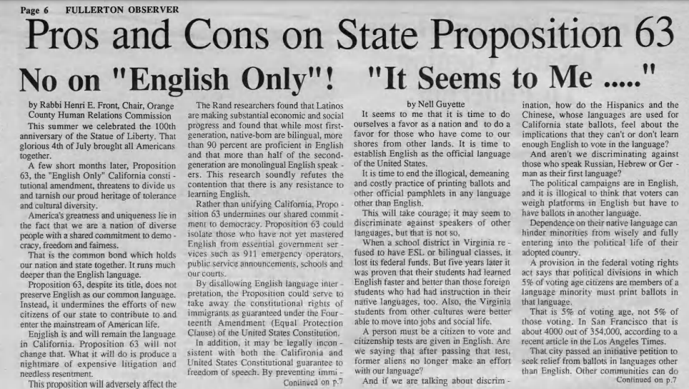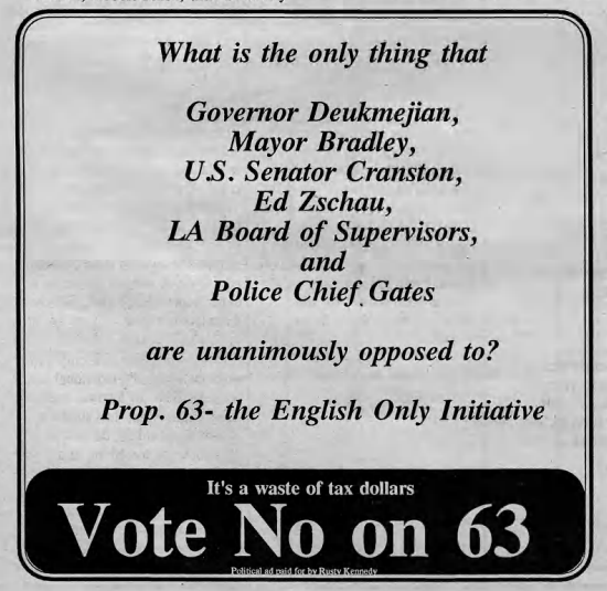 Californians voted to pass Proposition 63, which made English the “official language” of the state, ignoring the huge number of Latinos (and other ethnic groups) here plus the fact that California used to be part of Mexico. It was exclusionary policies like this that led to California flipping from red to blue (Republican to Democrat majority) in the late 1990s.