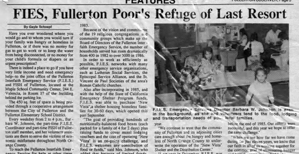 Local non-profit Fullerton Interfaith Emergency Services (now Pathways of Hope) opened the city’s first homeless shelter, with 12 to 20 beds for homeless families.