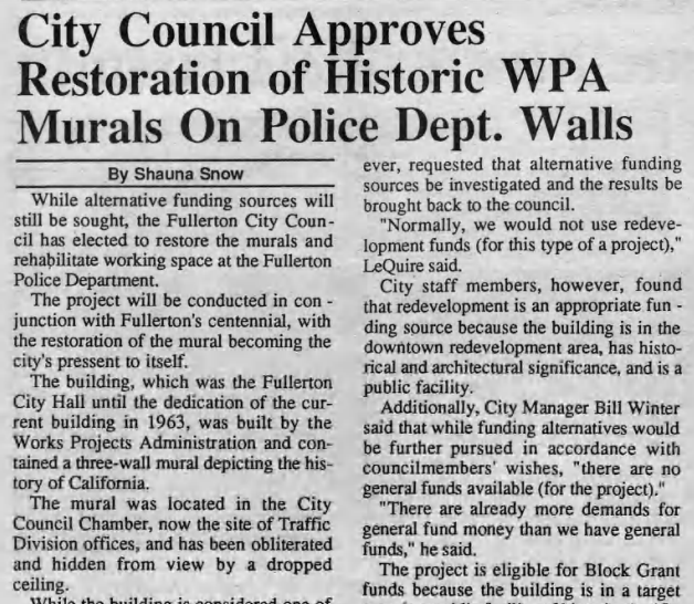 In historic public art news, council approved funding to restore the large WPA-era mural “The History of California” in the police station, formerly City Hall.