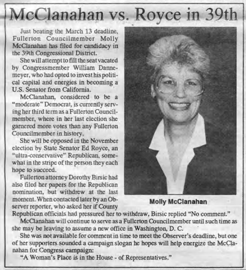 1992 was an election year. Democrat Bill Clinton defeated Republican George Bush and independent Ross Perot. Locally, Republican Ed Royce defeated Democrat city councilmember Molly McClanahan for congress.