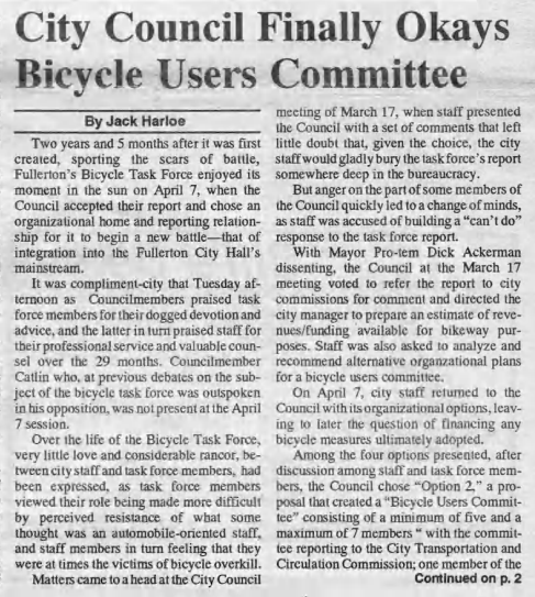 In transportation news, City Council finally approved a Bicycle Users Subcommittee, tasked with advocating for the needs of bicyclists.