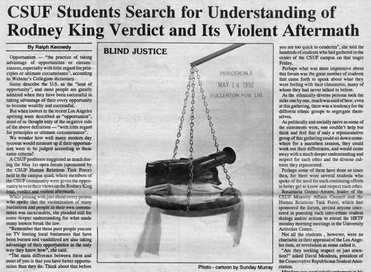 The Fullerton Observer newspaper was formed in 1978 by Ralph and Natalie Kennedy and friends to provide a more progressive counterbalance to the more conservative Fullerton News-Tribune and Orange County Register. The Fullerton Public Library has digital archives of the Observer stretching back to 1979. I am in the process of reading over each year and creating a mini-archive. Here are some top news stories from 1992.