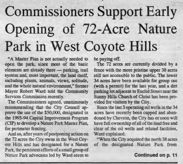 On a more positive note, the Planning Commission recommended that the City use $50,000 to develop a Nature Park Master Plan, for perimeter fencing of what is now the Robert Ward Nature Preserve in Coyote Hills. This area would not fully open until 2023–about 30 years later.