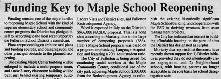 “A suit filed by two Fullerton homeowners, Nadene Ivens and Roy Kobayashi, challenging the validity of the Plan for Redevelopment Area 4 has been settled, and promises to result in expenditures for low and moderate income housing of $14,662,000 by fiscal year 1998-99,” the Observer reported. “Perhaps the most significant feature of the stipulated agreement was the targeting of 50% of the assisted units for households whose incomes are below 45% of median income (approximately $23,500).”