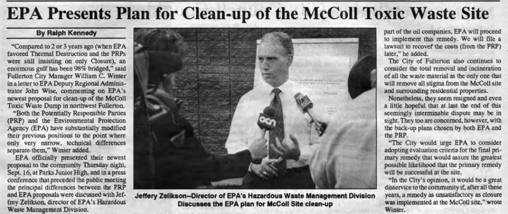 Meanwhile, the City of Fullerton preferred EPA’s original plan of “removal and incineration of all the waste material as the only one that will remove all stigma from the McColl site and surrounding residential properties.”