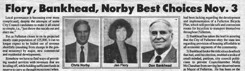 Several candidates ran for three open seats on Fullerton City Council. The Observer endorsed Jan Flory, Don Bankhead, and Chris Norby.