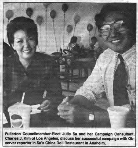 Sa was the first Asian American to serve on City Council. She was born in Korea of Chinese parents, and had lived in Fullerton for the past 17 years. She was a business owner and a member of the Chamber of Commerce.