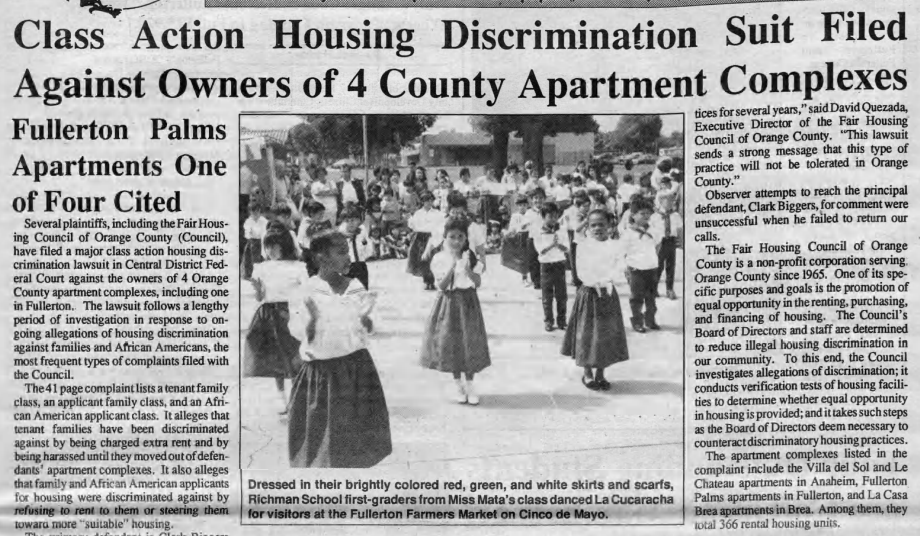 Several plaintiffs, including the Fair Housing Council of Orange County, filed a class action housing discrimination lawsuit against the owners of 4 Orange County apartment complexes, including one in Fullerton.