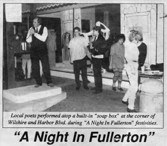 “The local arts community joined talents recently to present a free night of dance, music, drama, and art during the 29th annual A Night in Fullerton,” the Observer reported. “Nearly 30,000 persons traveled to 14 locations throughout the city to survey an eclectic evening of performances ranging from barbershop quartets to water-color demonstrations to classical and contemporary ballet.”