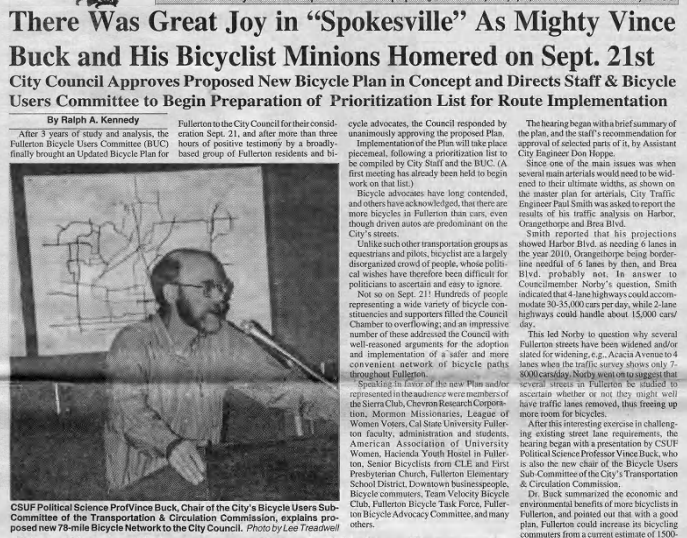 Dr. Vince Buck, longtime member of the Bicycle Users Subcommittee, “argued strongly for approving the full plan so that Fullerton would have a chance of increasing its number of bicycle-commuters from an estimated 1-2% of the work force to an achievable objective of 10-12%. Such an increase would make a substantial contribution to clean air in this area, he indicated.”