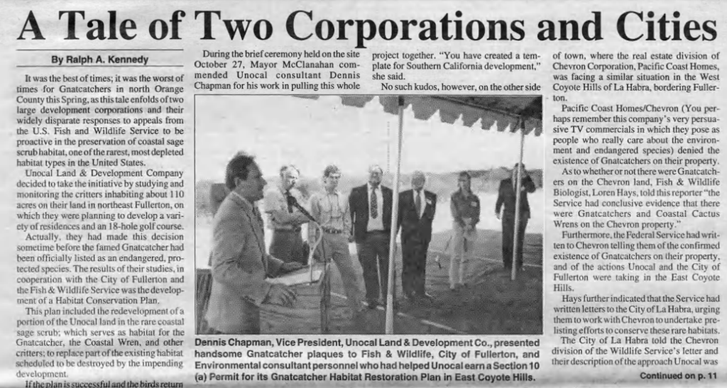 Chevron, which owned west Coyote Hills, took a different approach: “Chevron’s response was to destroy about 100 acres of the rare habitat, just prior to the March announcement by Interior Secretary Bruce Babbitt that the Gnatcatcher had been officially listed as endangered.”