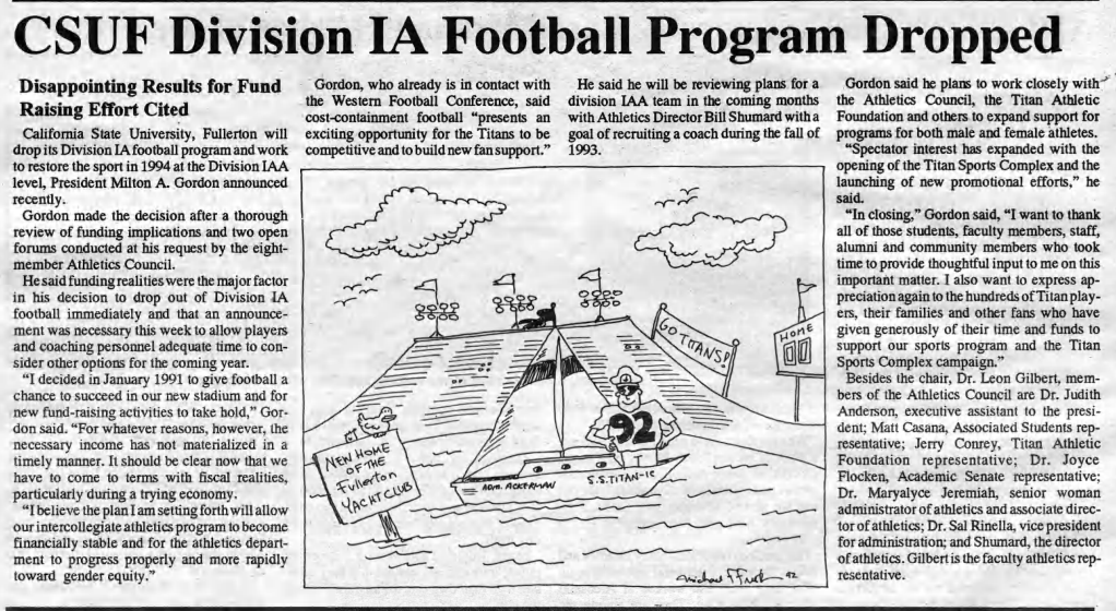 The City of Fullerton had spent millions of redevelopment dollars to build a sports complex at CSUF, partially for the college’s football team. And then, CSUF dropped football.