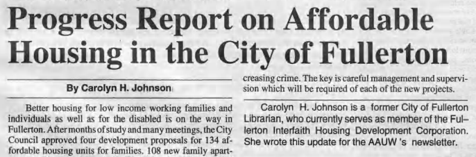 According to a 1987 state law, the city of Fullerton was required to set aside and spend 20% of its tax revenue dollars for affordable housing. But for years the city opted not to allocate monies for affordable housing. This prompted local residents to sue the city and under the terms of a settlement agreement, the City began actually approving and funding a number of affordable housing projects, such as the following: