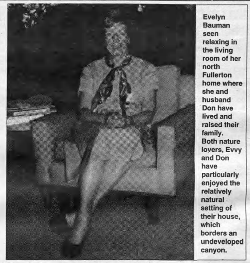 Evelyn Bauman died at age 75. She too was involved in many important community groups, including: YWCA Nursery School, Children’s League, Fullerton Friends of Music, Art Alliance, Friends of Fullerton Arboretum, Habitat for Humanity, El Dorado Ranch Preservation Committee, and the CSUF Women’s Studies Program Council.