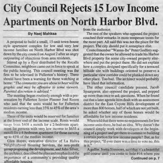 “A proposal to build a small, 15-unit town-house style apartment complex for low and very low income families on North Harbor Blvd was shot down by the city council on August 2 after an angry outpouring of objections from area residents,” the Observer reported.