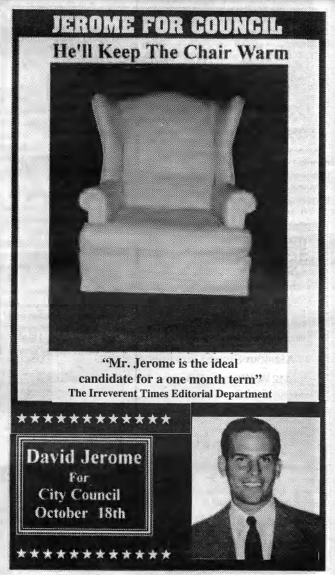 Some, like David Jerome, ran a humorous campaign for one of the three-week terms between the special and general election with the slogan, “He’ll Keep the Chair Warm.”