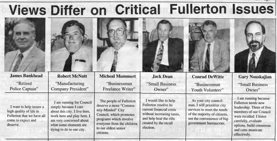 Nine former mayors of Fullerton expressed their opposition to the recall efforts: Richard C. Ackerman, Robert Ward, Francis Wood, Robert Root, Jerry Christie, Burton Herbst, Howard Cornwell, William Kroeger and Irving C. Chapman.