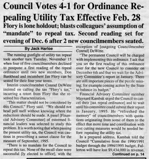 But it was not a total loss for the recall proponents. Taking the hint from voters, the newly-configured City Council voted to repeal the Utility Tax in the three weeks between the special and general elections, a brief window when they had a majority. Flory was the lone dissenter.
