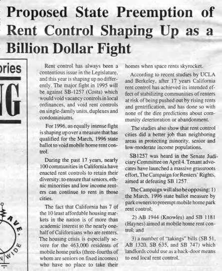 There was also a newly proposed state law SB-1257 (Costa) which would void vacancy controls in local ordinances, and void rent controls on single-family units, duplexes and condominiums.