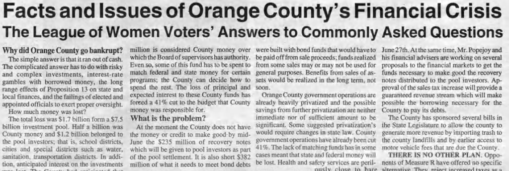 Ultimately, the OC Board of Supervisors voted to place a half-cent sales tax increase in the ballot to stem the budgetary bleeding. It was called Measure R. Did it pass? Stay tuned for my notes from 1996!