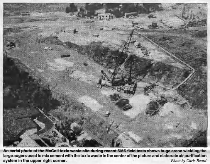 “With distribution of a slick and persuasive, 8-page, “Community Action Report”, the McColl Site Group (responsible oil companies) have thrown their anti-SMS (Soft Material Solidification) hat into the ring,” the Observer reported. “The two goals of SMS are: to neutralize the waste, and to solidify it sufficiently to prevent migration.”