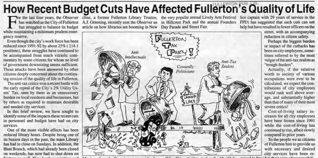 The city’s work force had been reduced since 1991-92 by about 25% (214.1 positions). Library hours were reduced. The Fullerton Museum Center lost about 29% of its annual allocation.