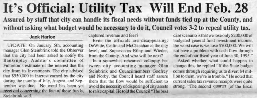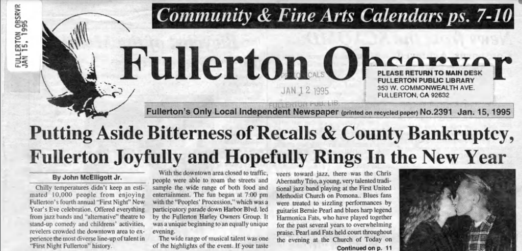 The Fullerton Observer newspaper was formed in 1978 by Ralph and Natalie Kennedy and friends to provide a more progressive counterbalance to the more conservative Fullerton News-Tribune and Orange County Register. The Fullerton Public Library has digital archives of the Observer stretching back to 1979. I am in the process of reading over each year and creating a mini-archive. Here are some top news stories from 1995.