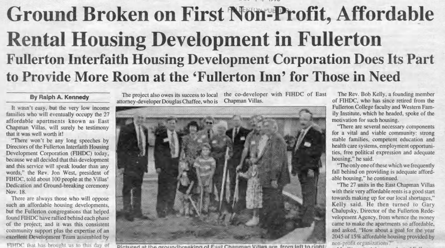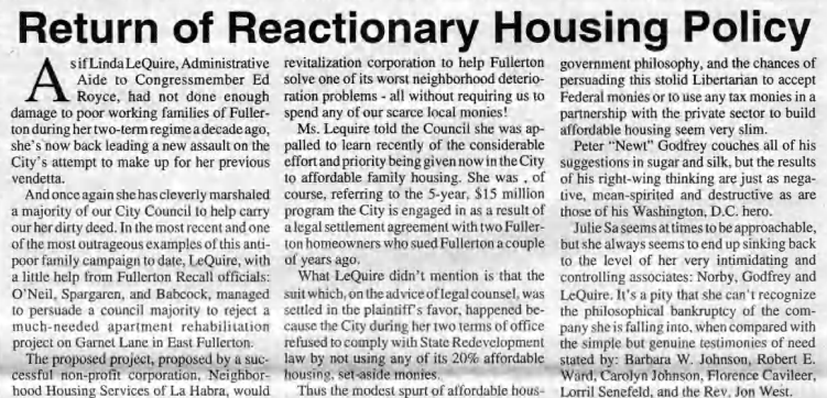 Throughout the 1980s, a conservative majority Fullerton City Council regularly refused to use Redevelopment funds to support the construction of affordable housing, despite state mandates that it do so. Then a few local citizens sued the city and won, forcing the city to approve a number of affordable housing projects in 1994. But the conservative element remained.