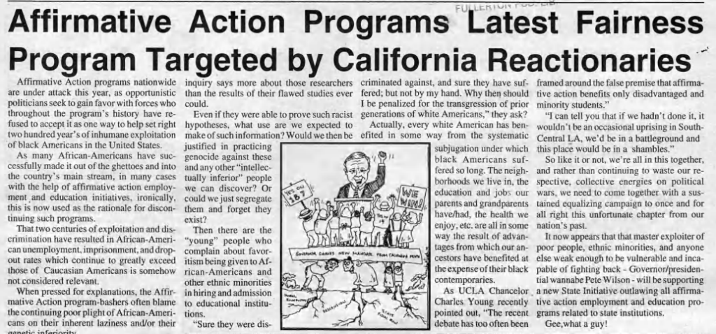 Pete Wilson supported a new State Initiative outlawing all affirmative action employment and education programs related to state institutions.