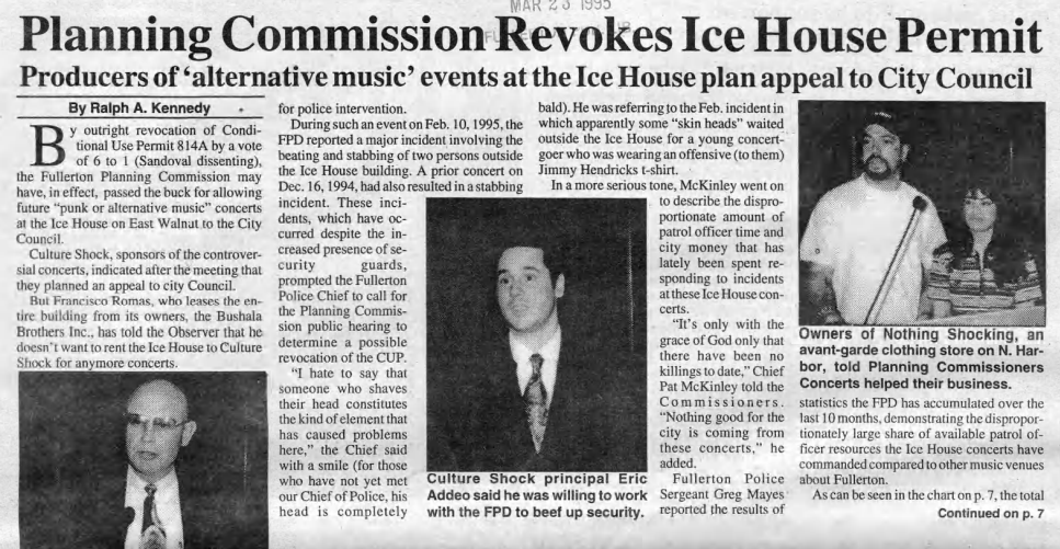 “The relatively large scale events put on by Culture Shock have resulted in an increasing number of calls for police intervention. During such an event on Feb. 10, 1995, the FPD reported a major incident involving the beating and stabbing of two persons outside the Ice House building,” the Observer reported, also describing “A Feb. incident in which apparently some ‘skin heads’ waited outside the Ice House for a young concertgoer who was wearing an offensive (to them) Jimmy Hendricks t-shirt.”