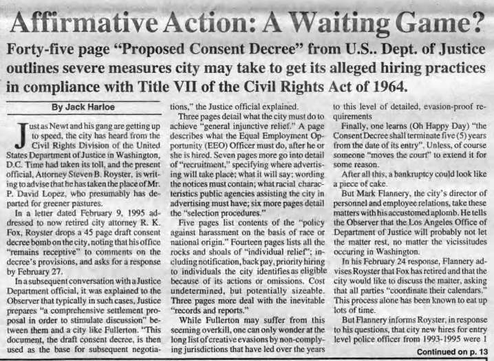 Meanwhile, Fullerton heard from the Civil Rights Division of the United States Department of Justice detailed what the city must do to achieve “general injunctive relief” regarding affirmative action programs.