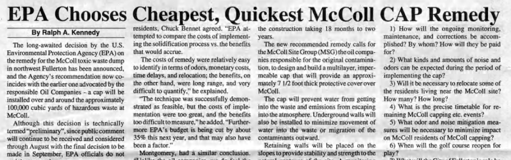 Regarding Fullerton’s first Superfund site, the McColl Toxic Dump site, 200,000 tons of oil waste under the northern part of what is now the Los Coyotes Golf Course, the oil companies responsible for the environmental degradation lobbied hard for the cheapest solution, capping the site and leaving the waste in place. The EPA had earlier proposed using chemicals to solidify the waste so it would be less likely to seep into the local groundwater aquifer.