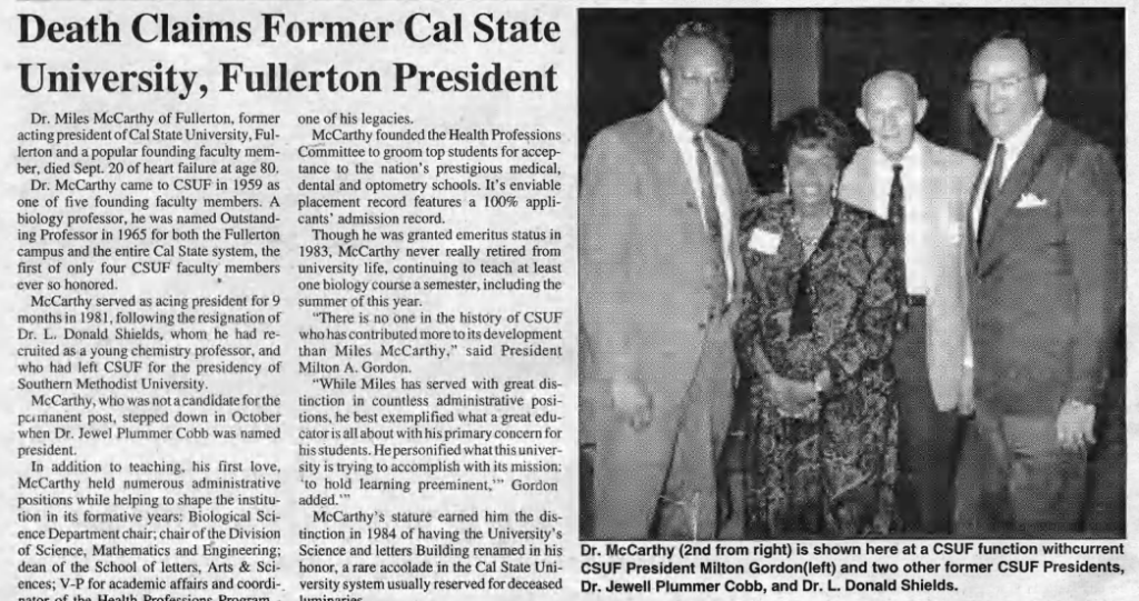 “Dr. McCarthy came to CSUF in 1959 as one of five founding faculty members. A biology professor, he was named Outstanding Professor in 1965 for both the Fullerton campus and the entire Cal State system, the first of only four CSUF faculty members ever so honored. McCarthy served as acting president for 9 months in 1981, following the resignation of Dr. L. Donald Shields, whom he had recruited as a young chemistry professor, and who had left CSUF for the presidency of Southern Methodist University,” the Observer reported. “McCarthy, who was not a candidate for the permanent post, stepped down in October when Dr. Jewel Plummer Cobb was named president.”