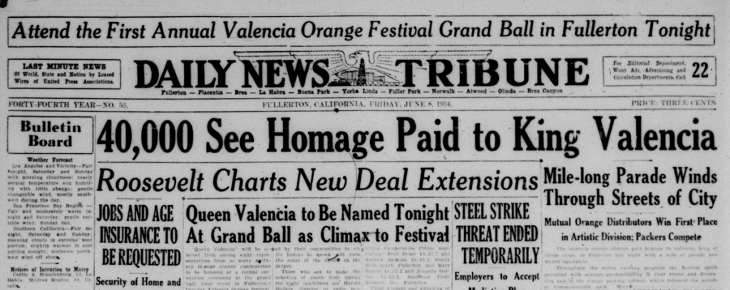 The Local History Room of the Fullerton Public Library has microfilm from the Fullerton Daily News-Tribune newspaper stretching back to 1893. I am in the process of reading over the microfilm, year by year, to get a sense of what was happening in the town over the years, and creating a mini archive. Below are some news stories from 1934.