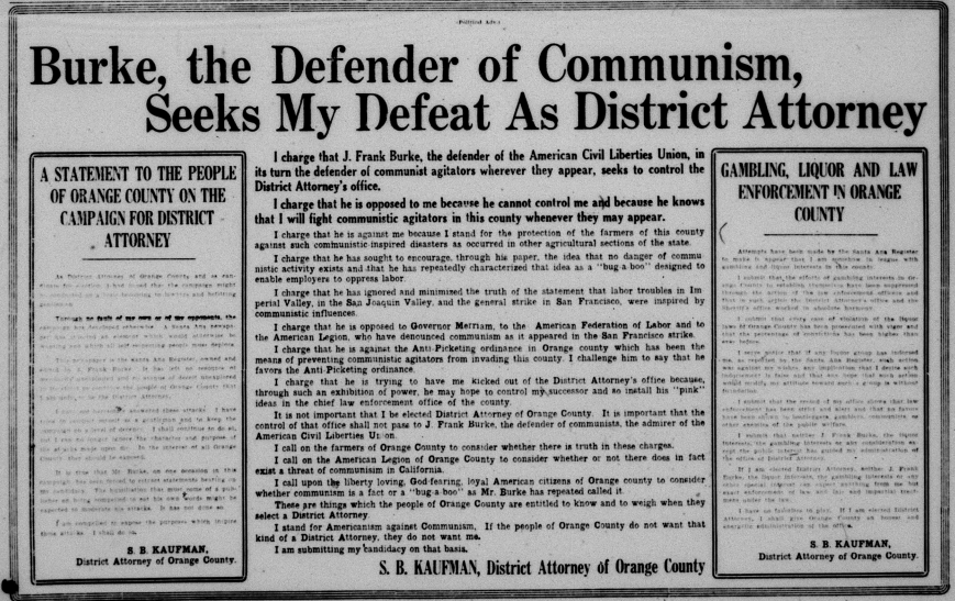 In the races for District Attorney and Orange County Sheriff, Red-baiting was a common mudslinging tactic.